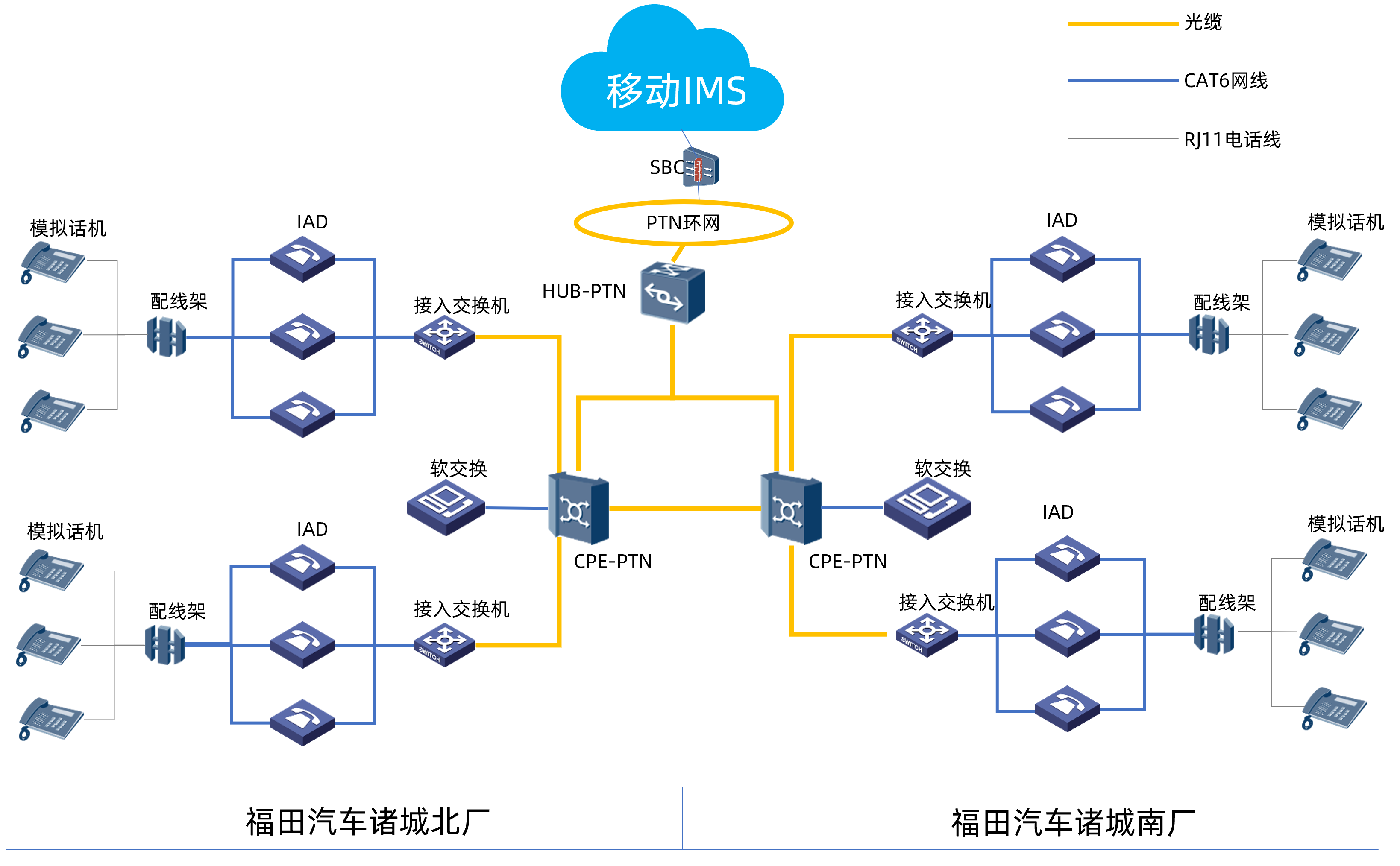 南北厂软交换设备下行通过内网对接IAD综合接入设备,IAD出电话线利旧弱电井配电间配线架连接到各部门办公话机,构建覆盖全厂的语音通信系统。