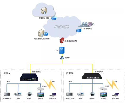 “班班通”教室网络组网全部采用光纤接入方式,核心路由设备连接各个区域汇聚设备,汇聚设备到校采用直连光纤,到校后进行分光接入教室,教室网关统一下挂教学终端。