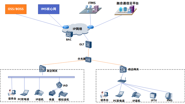 • “云PBX平台+PON”方案,云平台提供整套IP语音通信系统解决方案,满足不同酒店的核心语音和办公业务需求,提高工作效率,也为客人提供完善的语音服务,提升满意度。既能确保业务的高度融合性,又能以最经济的终端式接入降低建设成本,并支持未来的平滑扩容,同时提供便捷的远程运维服务,降低日常维护成本。