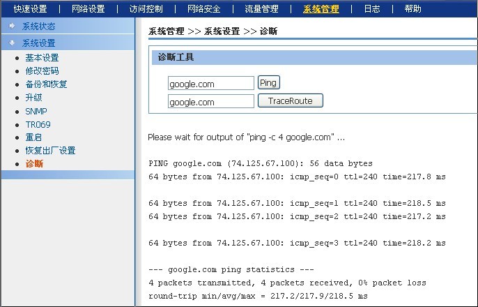 在【系统管理】-【系统设置】-【诊断】界面,可以执行ping命令,查看设备本身是否可以上网,如下图:(下图结果表示ping通了google.com,设备本身可以上网。)